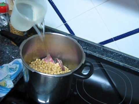a la mañana siguiente tiramos el agua . y echamos los garbanzos en una olla, (la olla que usamos en casa es exprés, con lo que rápidamente estará la comida echa..